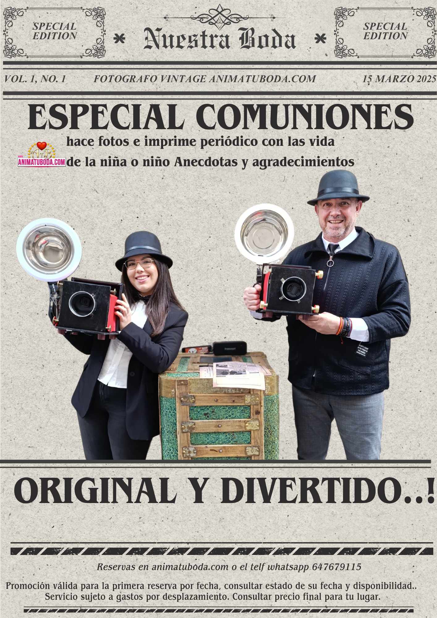 Fotografo Vintage NUEVO! Un servicio original y exclusivo: un fotógrafo caracterizado imprime al instante periódicos antiguos personalizados con la foto del protagonista de la comunión. Además, incluye la estampita de comunión del niño o la niña en distintos formatos como recuerdo para invitados. Un detalle único que sorprende a todos.